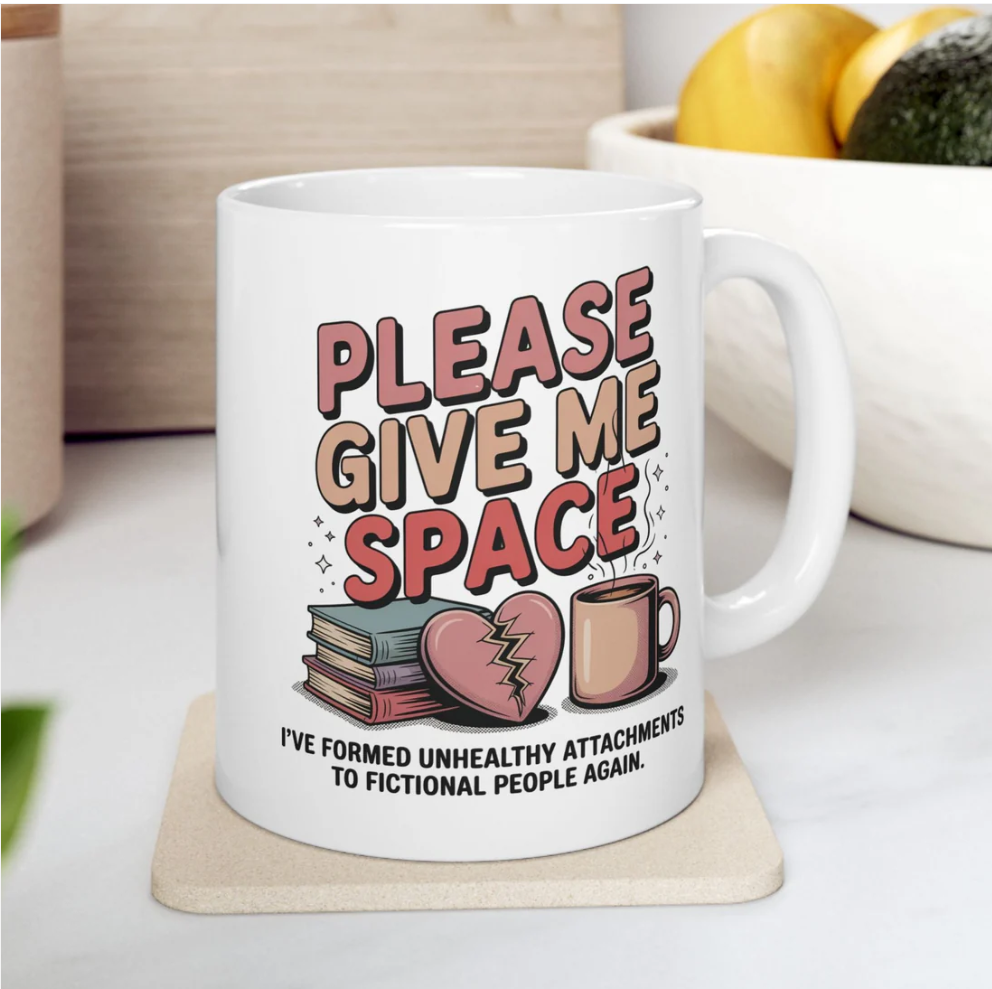- A cozy mug that reads: “Please give me space. I’ve formed unhealthy attachments to fictional people again.”