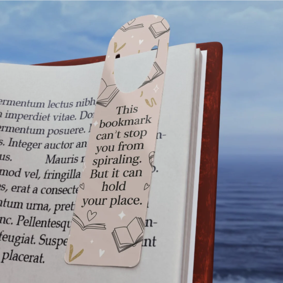 - A cheeky bookmark that promises: “This bookmark can’t stop you from spiraling. But it can hold your place.”
